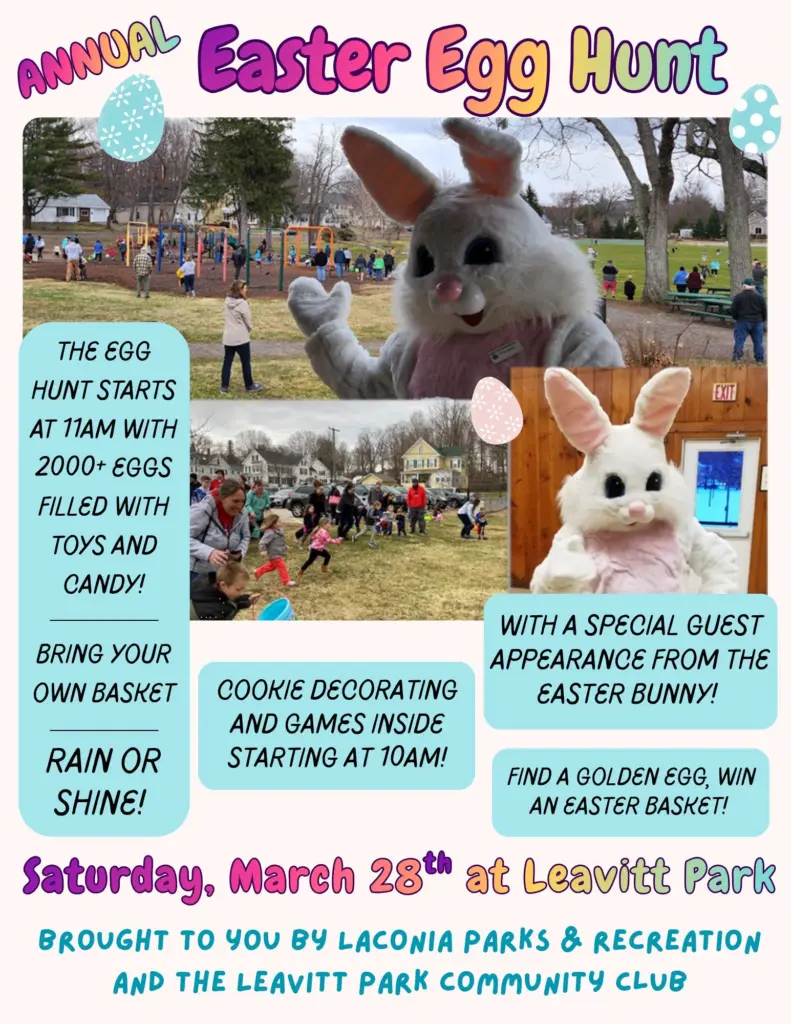 Join Laconia Parks & Rec and the Leavitt Park Community Club for our Annual Easter Egg Hunt, featuring over TWO THOUSAND EGGS filled with candy and toys! Find one of the golden eggs to win an easter basket!