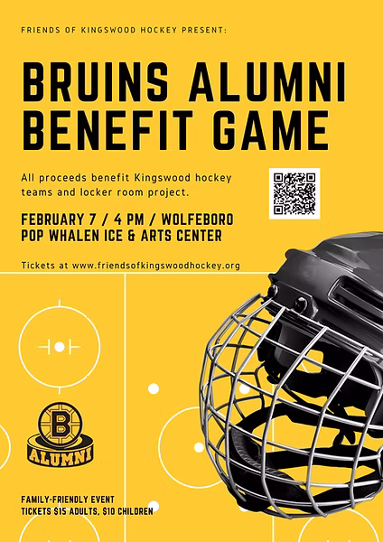 Boston Bruins Alumni Game at Pop Whalen Ice & Arts Center, 4PM. $15 Adults, $10 Students, Children 5 and Under FREE.