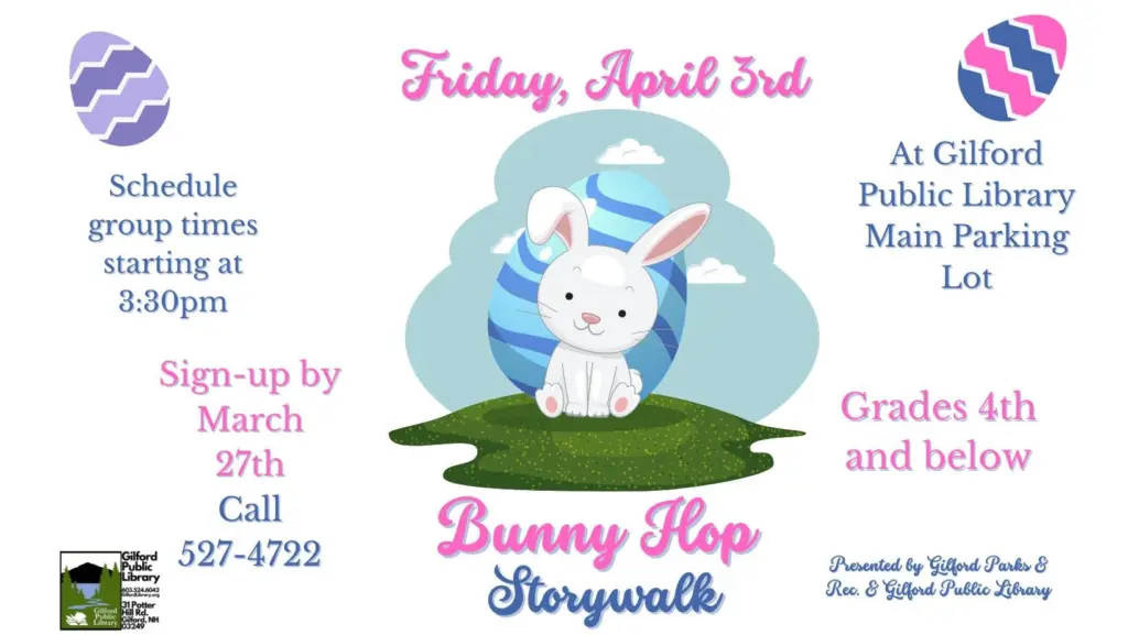 Gilford Parks-Recreation Department have teamed up with us to celebrate Easter with an adventurous storywalk that includes an egg hunt! *Sign-up is required* Call Gilford Parks-Recreation Department: (603)527-4722. The deadline to sign-up is March 27th. This event is for 4th graders and under, accompanied by parents/guardians.