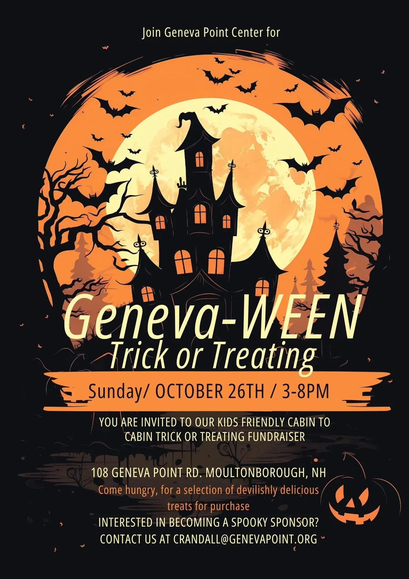 Bring your family to historic Geneva Point Center, a nonprofit conference and retreat center located at 108 Geneva Point Rd. in Moultonborough, for their annual “Geneva-Ween” Trick or Treat event! This free event, taking place on Sunday, October 26th, from 3:00-8:00PM, will include safe trick-or-treating for candy and other delicious treats, games, and a photo booth, all set against decorated cabins sponsored by local businesses. For more information or if you would like to be a Sponsor, contact Chris Randall at Geneva Point Center, 603-253-4366 or crandall@genevapoint.org