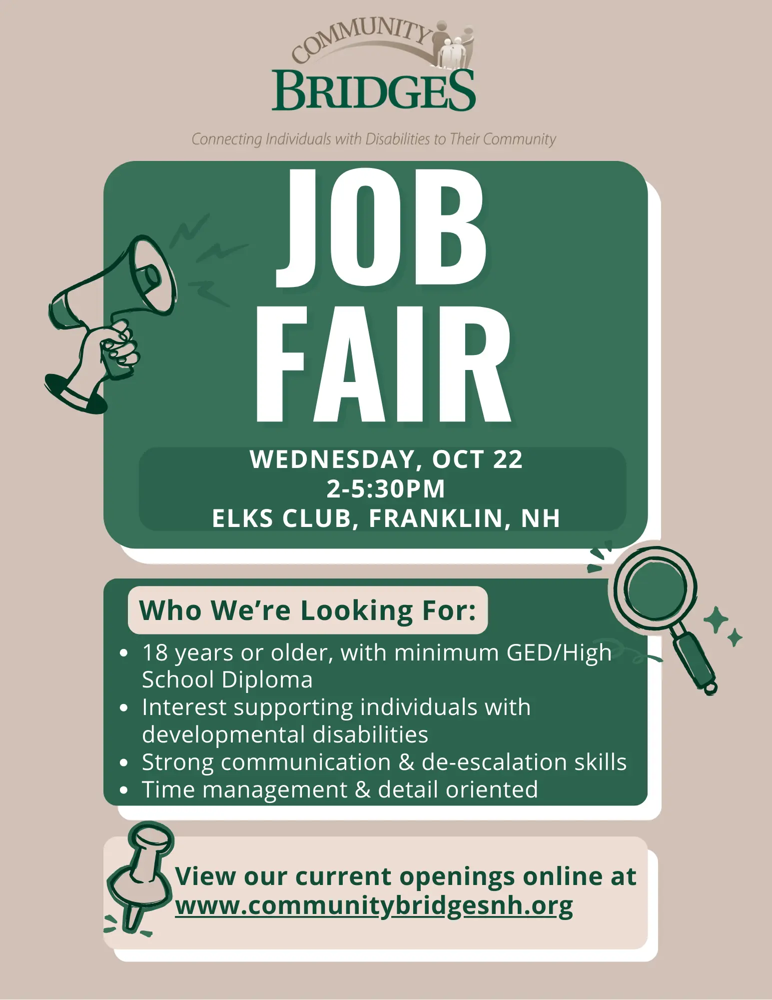 Community Bridges is hosting a job fair on Wednesday, October 22nd from 2-5:30pm at the Elks Club in Franklin, New Hampshire. Community Bridges is a non-profit agency that supports individuals with developmental disabilities, with our main office located in Concord. At this event, people would have the opportunity to learn more about our available positions. We currently have paid per-diem, part-time, and full-time staff opportunities across multiple locations, including: Andover, Boscawen, Bradford, Concord, Epsom, Franklin, Loudon, Northfield, Salisbury. Please join us for this event! To learn more about open positions, please visit our website at www.communitybridgesnh.org/careers