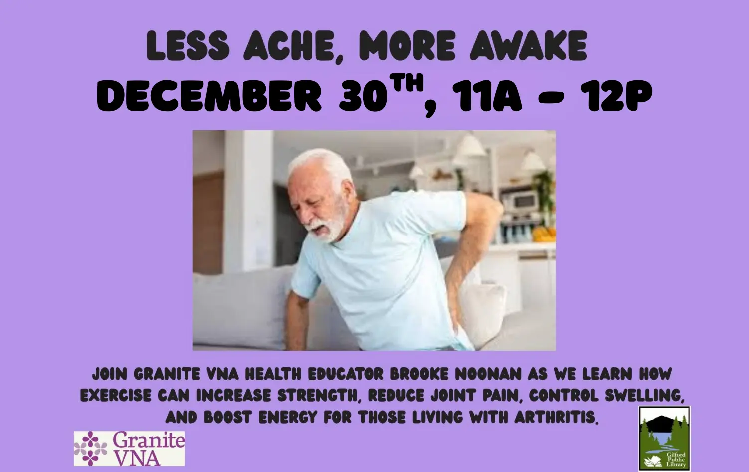 Aches and pains from arthritis may become a barrier to regular exercise. Join Granite VNA Health Educator Brooke Noonan as we learn how exercise can increase strength, reduce joint pain, control swelling, and boost energy for those living with arthritis.