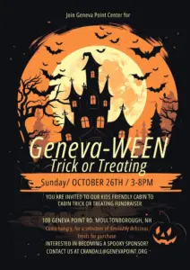 Find out more »Bring your family to historic Geneva Point Center, a nonprofit conference and retreat center located at 108 Geneva Point Rd. in Moultonborough, for their annual “Geneva-Ween” Trick or Treat