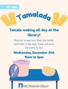 Come learn how to make tamales at the library! We’ll be showing how to make them, and taste them once they’re done cooking!