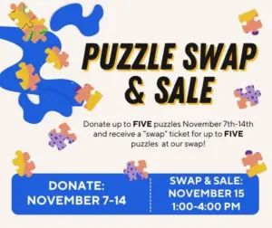 Need some new puzzles for the chilly season? The Lincoln Public Library Puzzle Swap & Sale is Saturday, November 15 from 1:00-4:00 PM. Bring up to FIVE puzzles to the library before the